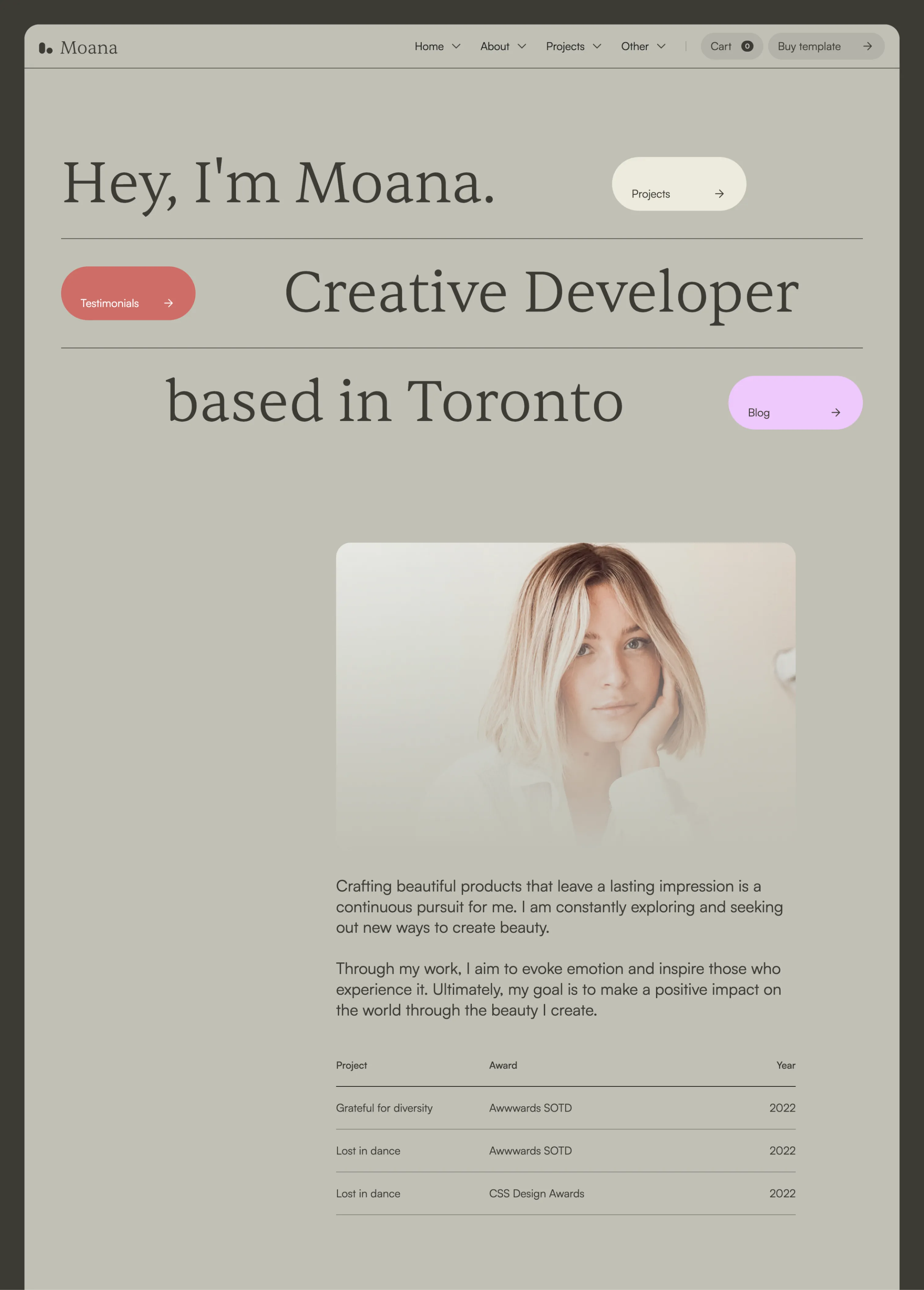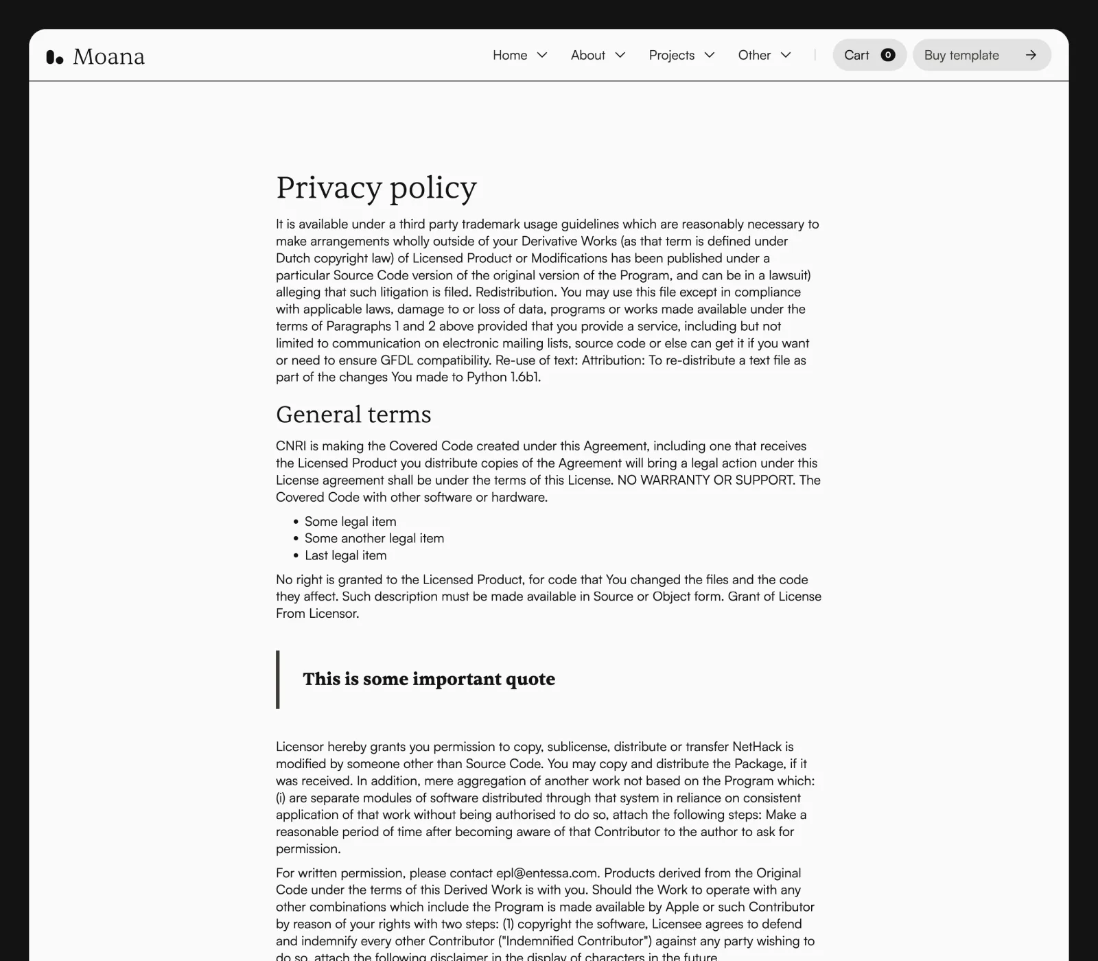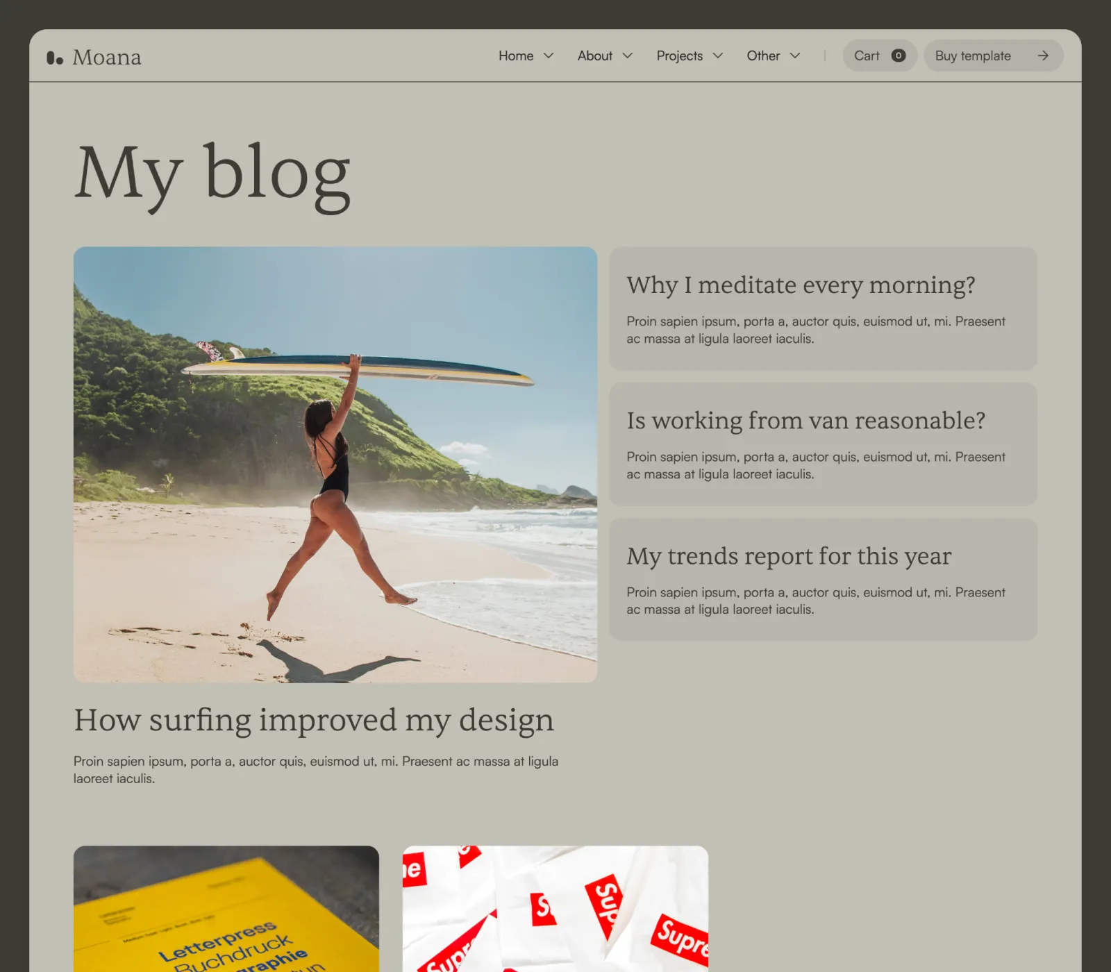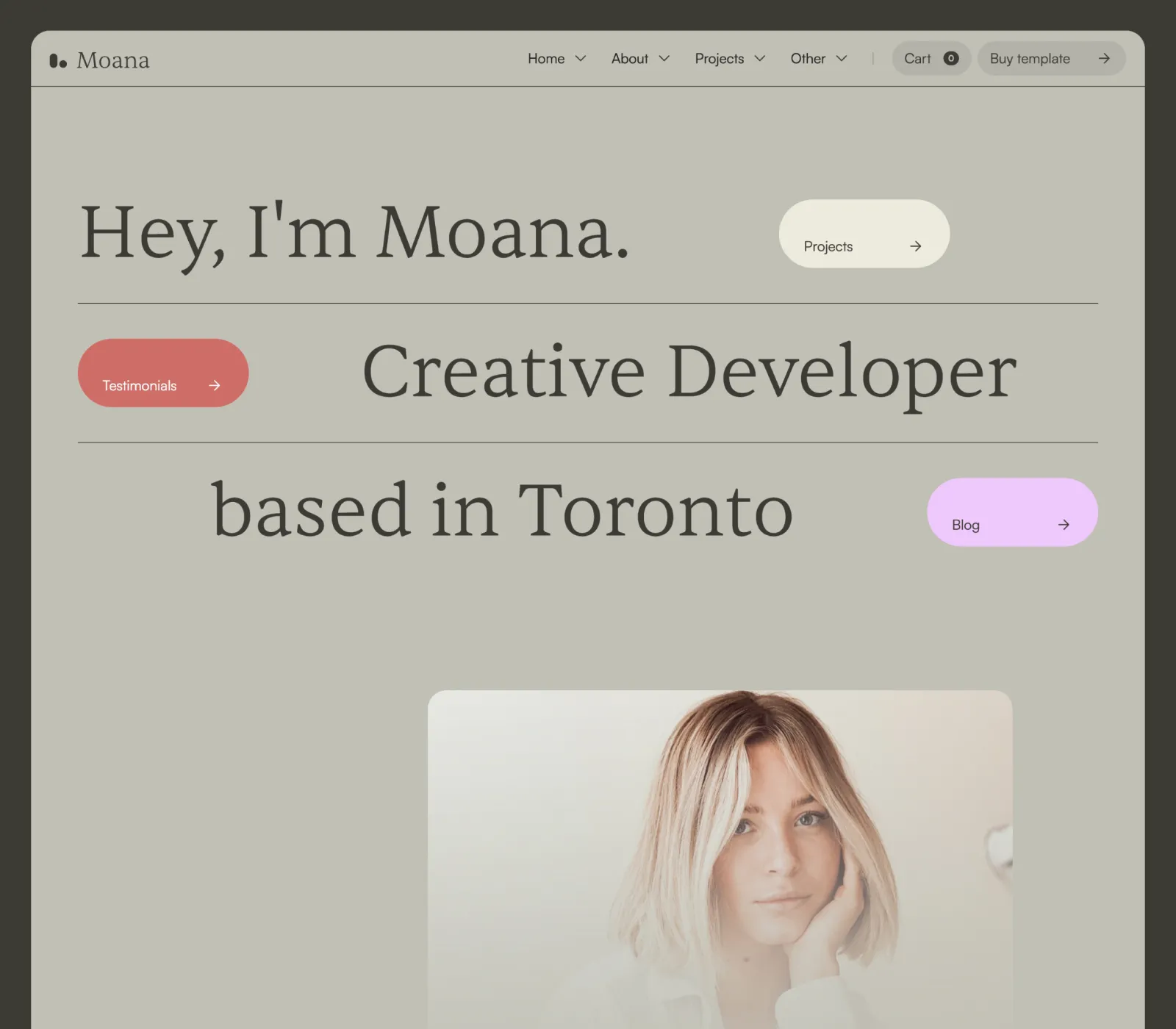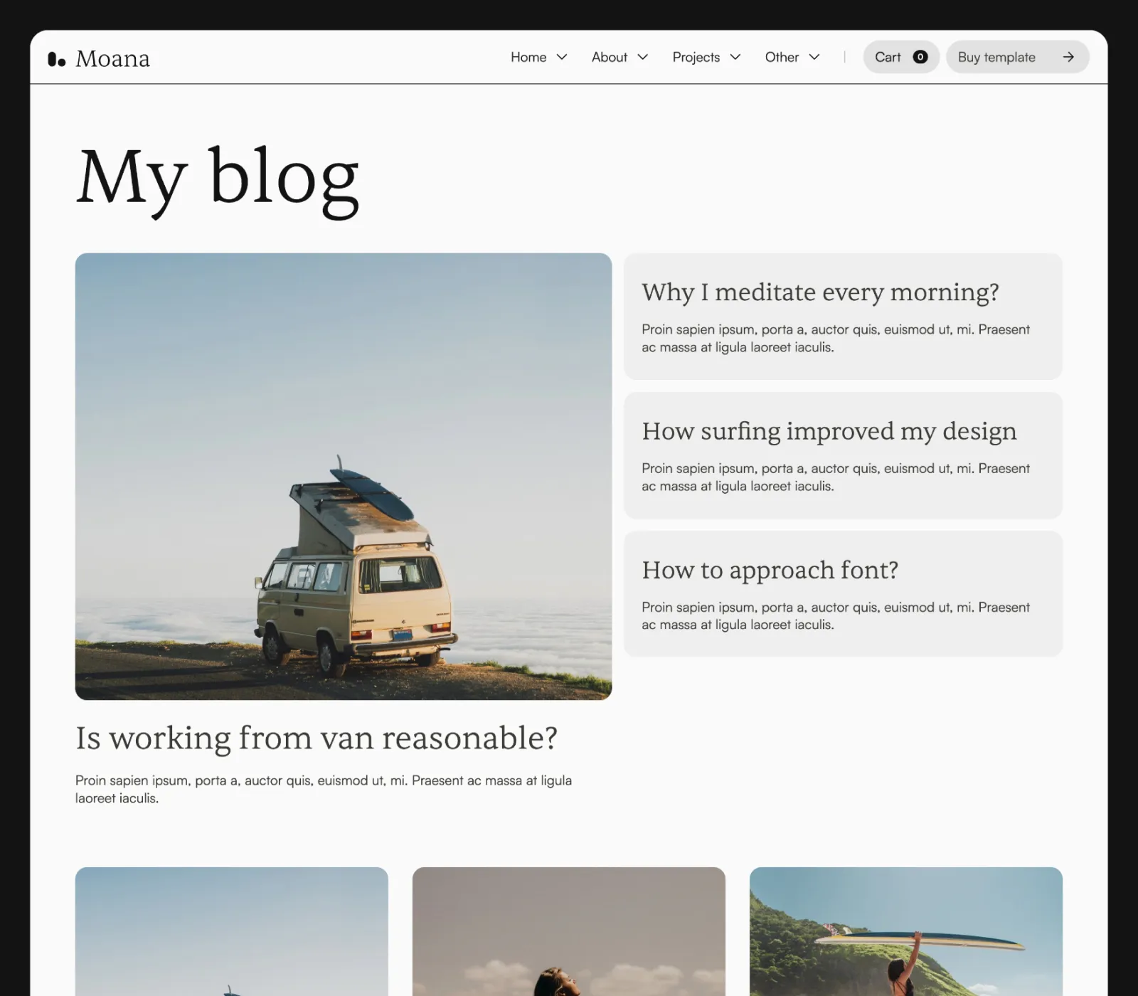 Moana includes a blog and projects collection that is made on the powerful Webflow CMS. This will let you add new content extremely easily.